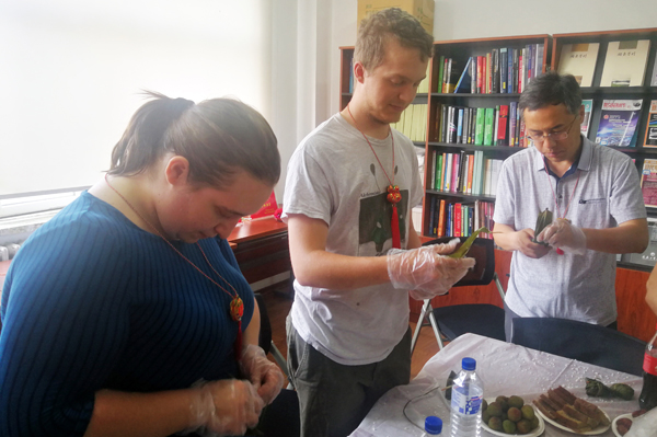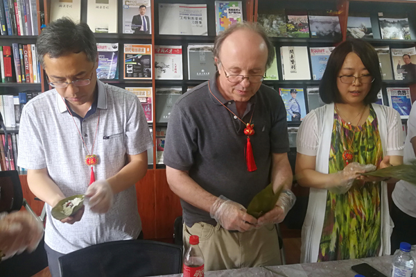 在学院的精心准备下,提前泡好的糯米、红枣、粽叶等材料整齐地摆放在桌子上。看到丰富的备料,大家更是迫不及待跃跃欲试,纷纷拿出“看家本领”。包粽子看似简单的一弯一绕,实则操作起来确有一定的难度。有包粽子经验的,将糯米、红枣等材料放在粽叶里填满扎牢;没有经验的,在同事们的帮助下,边看边学边包。一个小时后,百余个形态各异、饱含祝福的粽子迅速成型,大家拿着自己包好的粽子相互品评、拍照留念。第二次参与包粽子活动的盖瑞·巴博尔教授经过此番体验后表示,来年还要参与这样有意思有意义的活动。李占国还为外国友人佩戴了香囊,送上节日祝福。